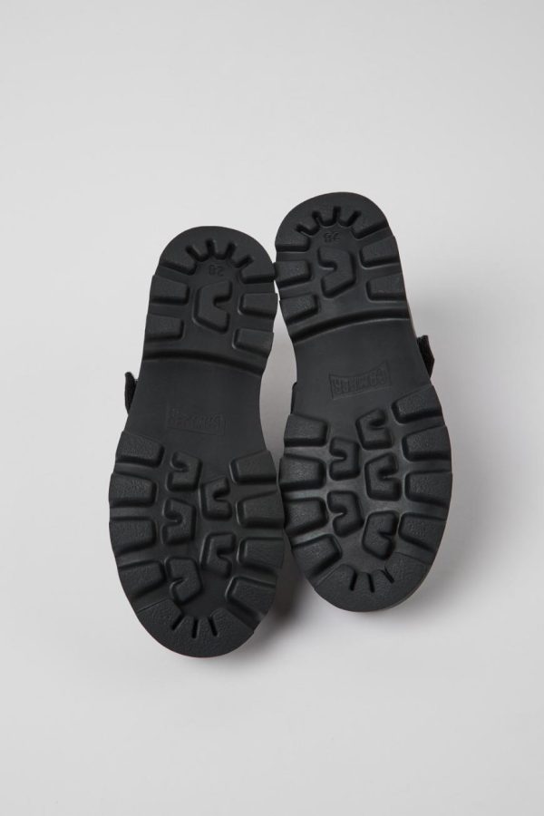 Black leather kids’ Mary Jane shoes with OrthoLite® Recycled™ removable footbeds and rubber outsoles.
