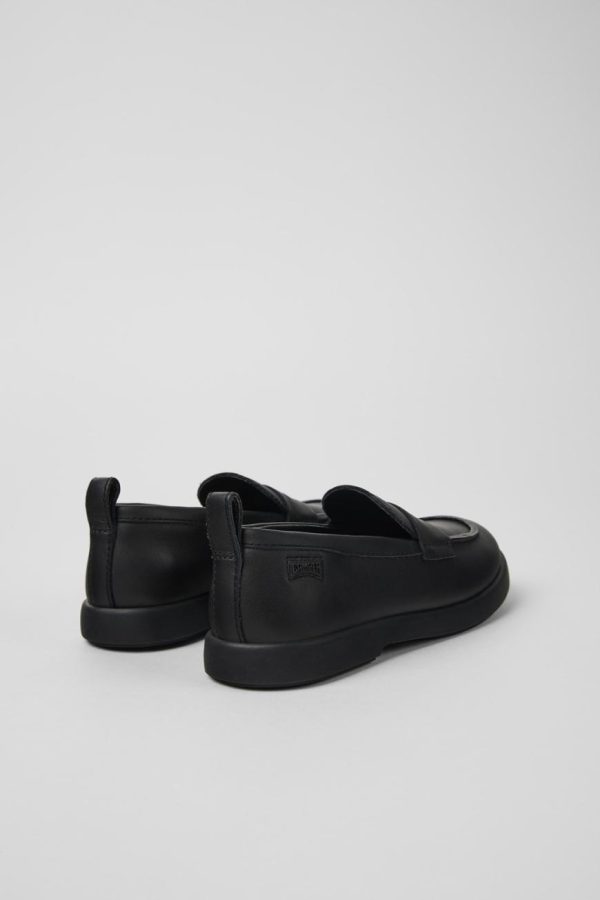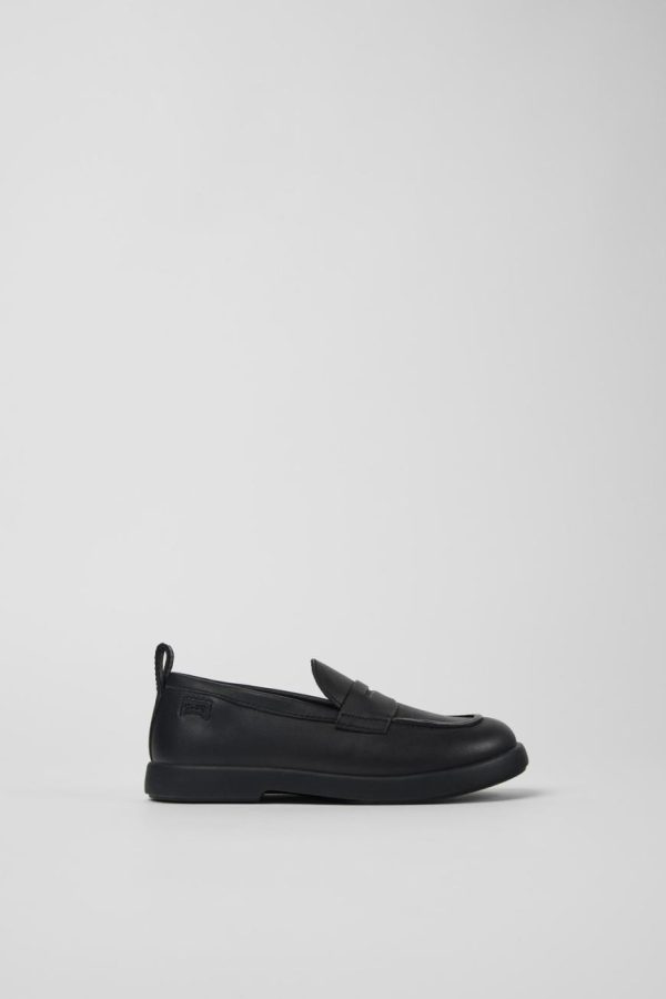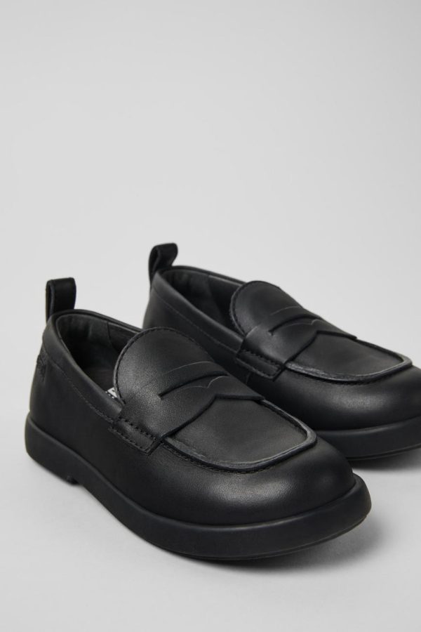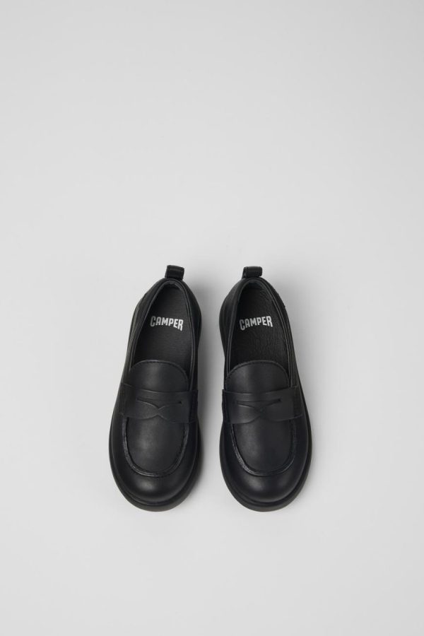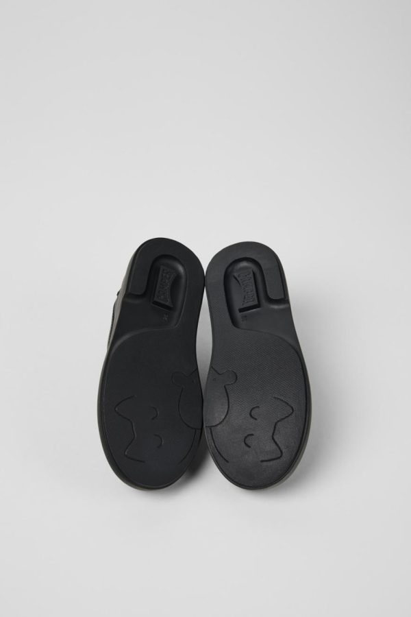 Black calfskin leather kids’ ballerinas with OrthoLite® Recycled™ footbeds and rubber outsoles.
