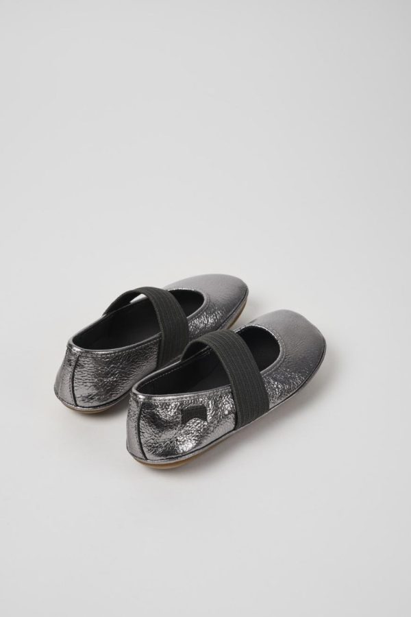 Metallic grey leather kid’s ballerinas with elastic band, removable EVA footbed and rubber outsole (20% recycled)