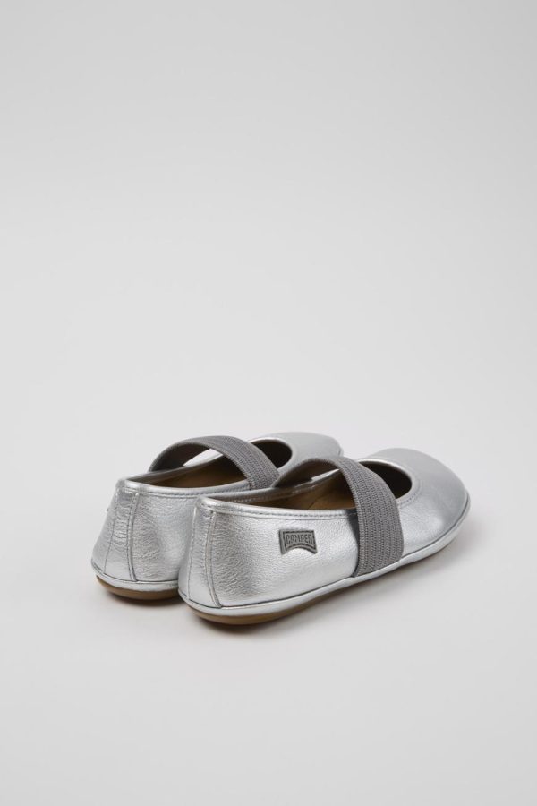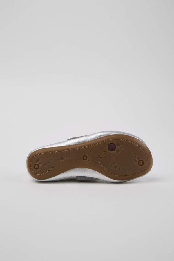 Silver calfskin leather kids’ ballerina with EVA footbed and recycled rubber outsoles (20% recycled).