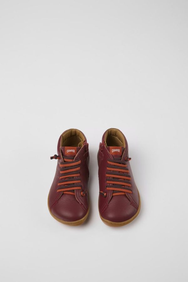 Burgundy leather kids’ ankle boots with elastic laces and rubber outsoles (20% recycled).