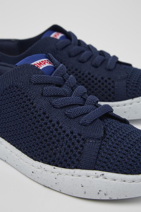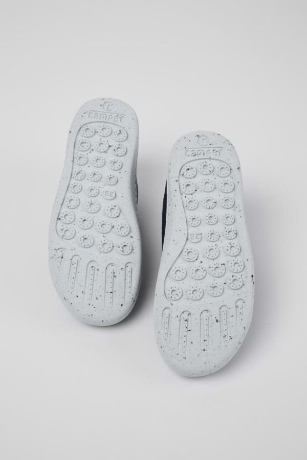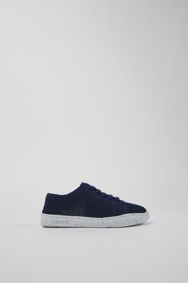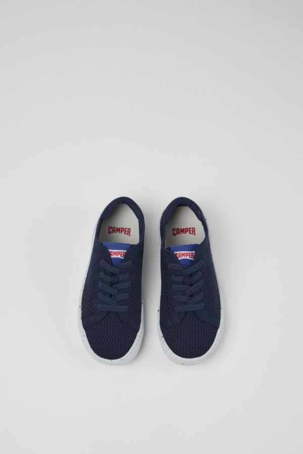 Blue textile kids’ slip-on shoes with lace closures, OrthoLite® Recycled™ footbeds and EVA outsoles.