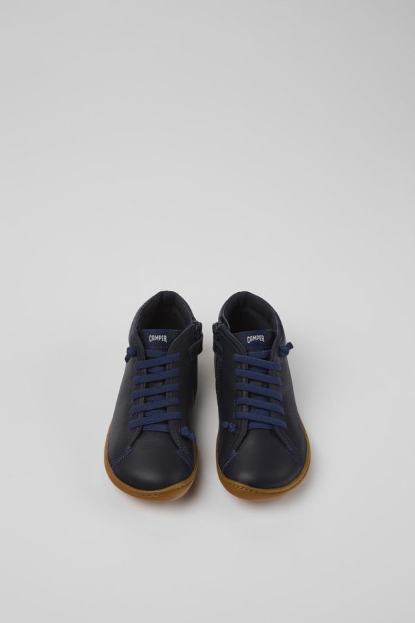 Blue calfskin leather kids’ ankle boots with EVA footbed, elastic laces, and rubber outsoles.