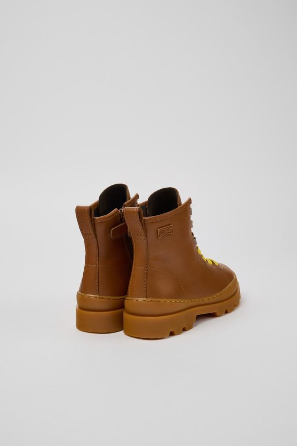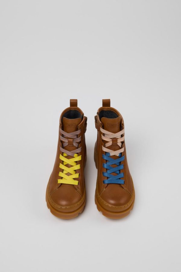 Brown calfskin leather kids’ ankle boots with OrthoLite® Recycled™ footbeds and rubber outsoles.
