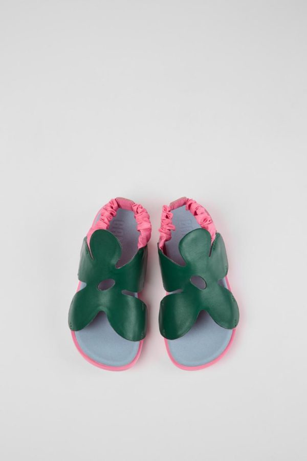 Green and pink leather and textile kids’ sandals with oversized flower cut-out, OrthoLite® Recycled™ non-removable footbeds, and rubber outsoles.