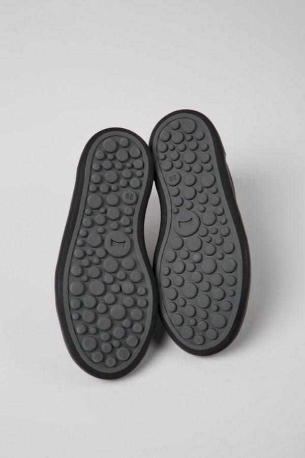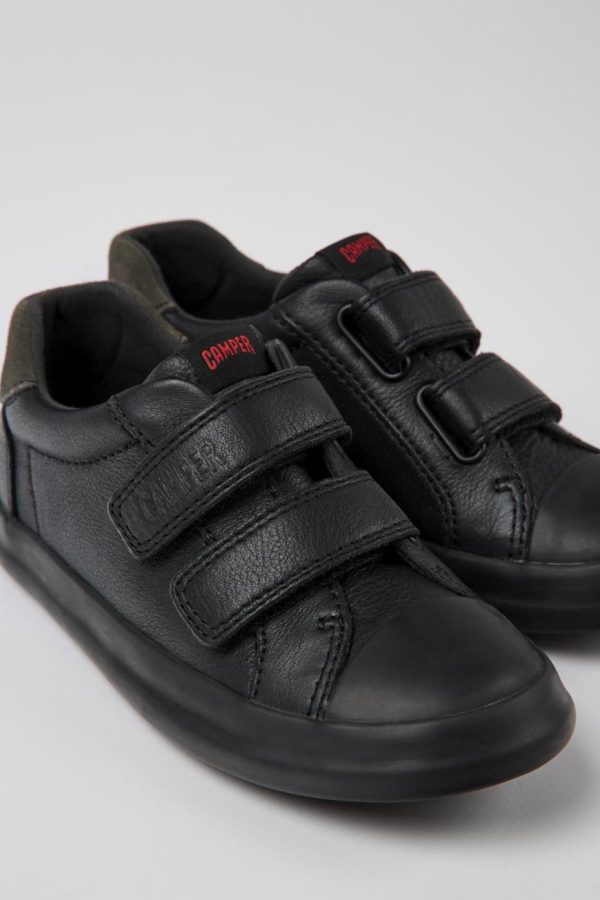 Black leather and nubuck kids’ sneakers with hook-and-loop closing system, OrthoLite® Recycled™ removable footbeds, and rubber outsoles.