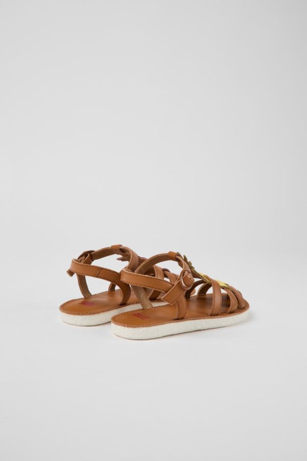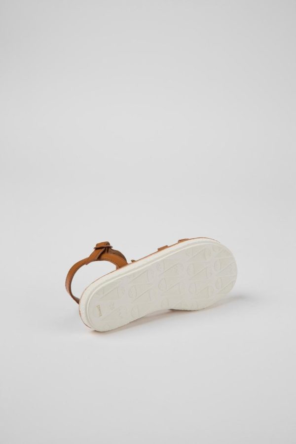 Multicolored leather kids’ sandals with a hook-and-loop closing system and rubber outsoles.