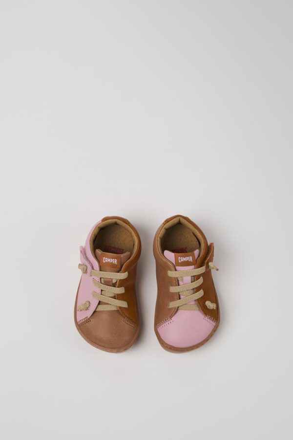 Multicolor leather kids’ shoes with hook & loop system, elastic laces, EVA footbeds, and rubber outsoles (20% recycled).