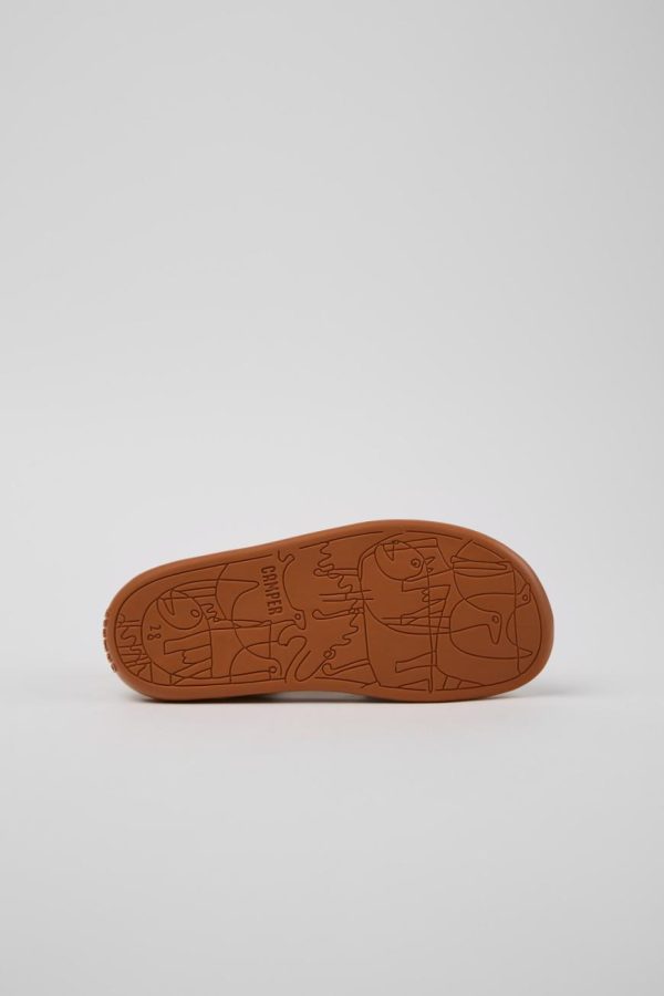 Brown leather kids’ sandals with rubber outsoles (20% recycled).