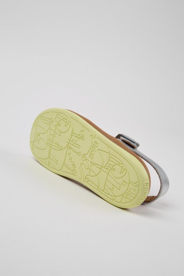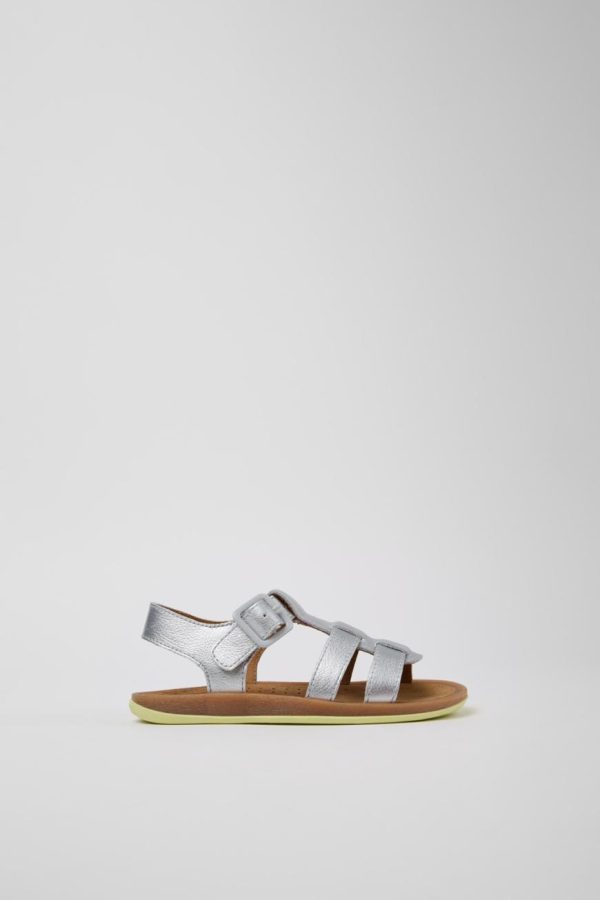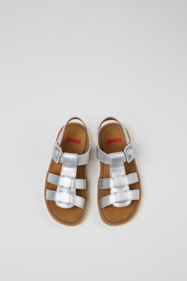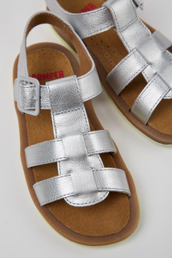 Silver leather kids’ sandals with rubber outsoles (20% recycled).
