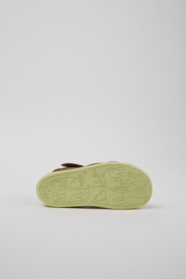 Brown calfskin leather kids’ closed sandal with hook & loop system and rubber outsoles (20% recycled).