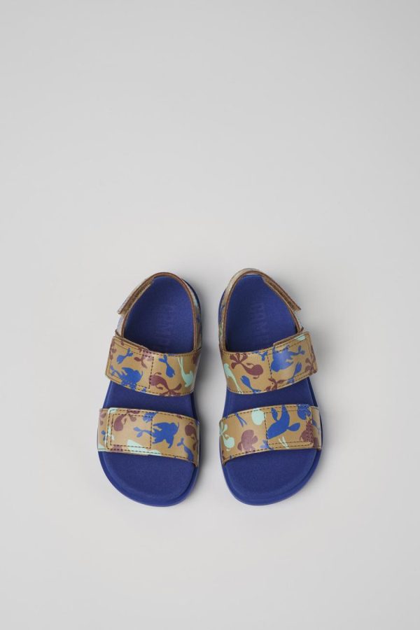 Multicolored leather kids’ 2-strap sandals with hook-and-loop closures, EVA footbeds and 100% rubber outsoles.