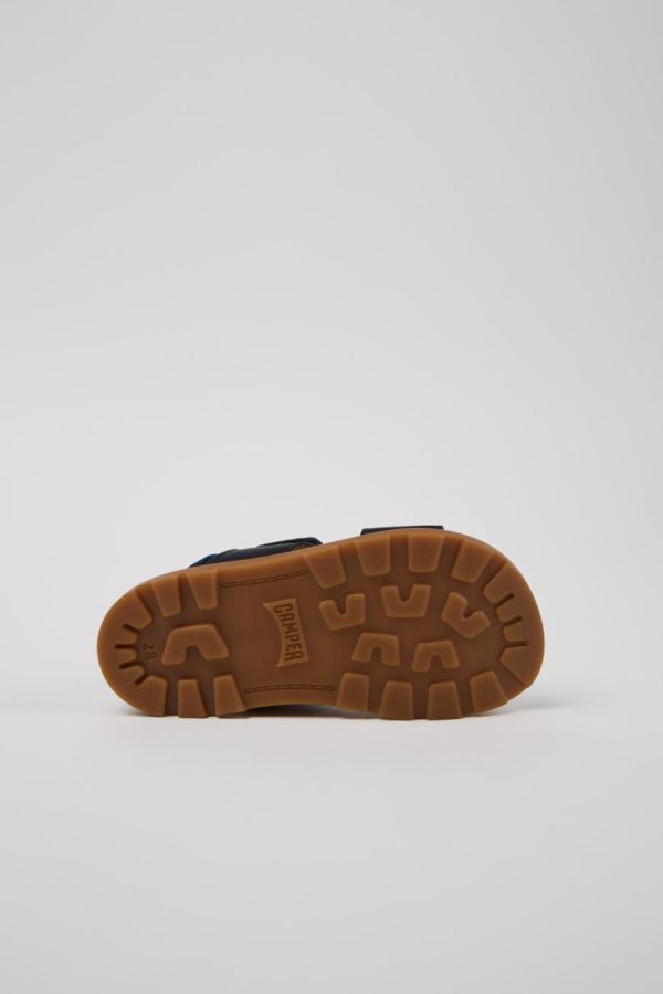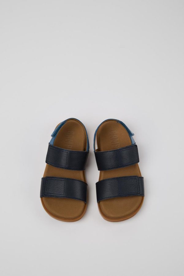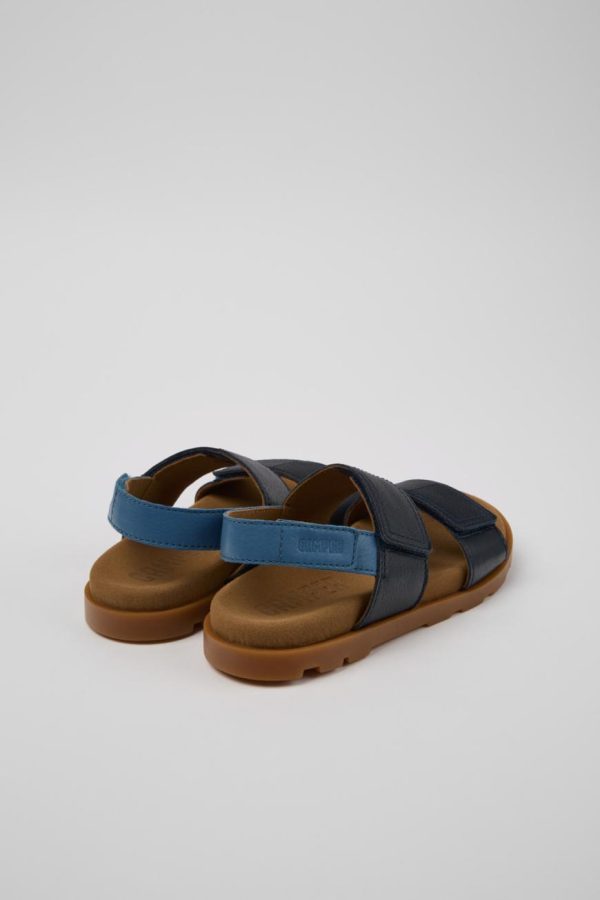 Blue calfskin leather kids’ sandal with hook & loop system, EVA footbed, and rubber outsoles.