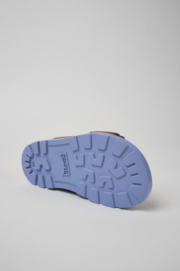 Brown leather kids’ 2-strap sandals with hook-and-loop closures, EVA footbeds and 100% rubber outsoles.