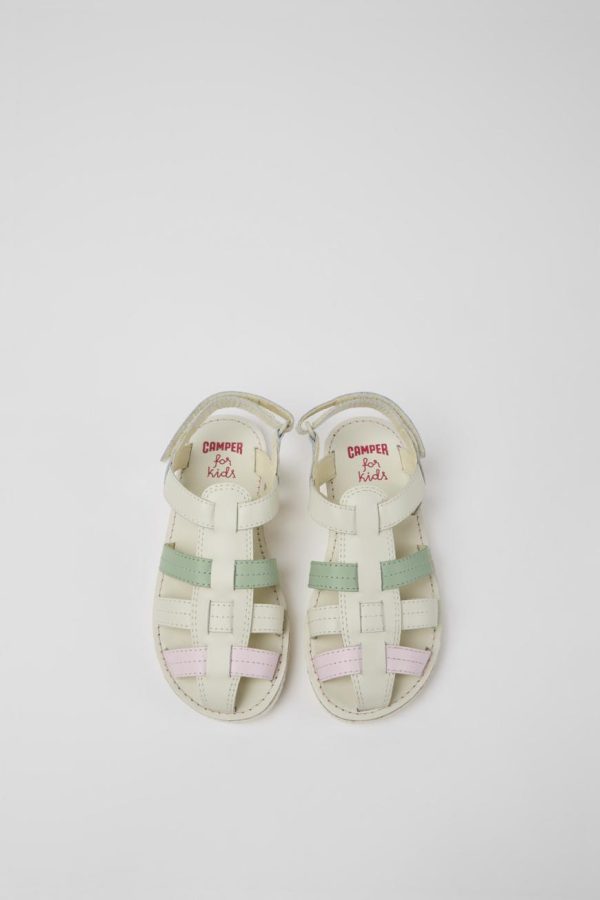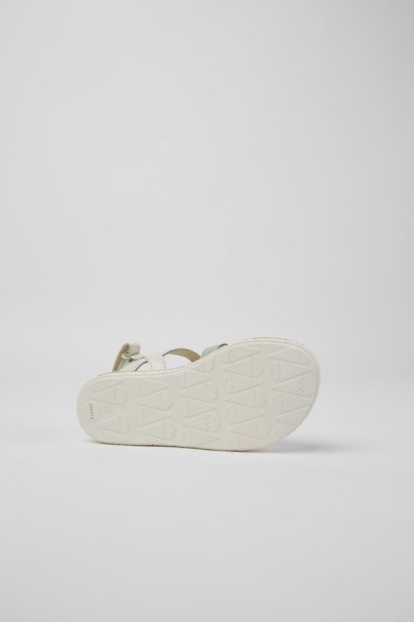 White, green, and pink leather girls’ sandals with hook-and-loop closing system and 100% rubber outsoles.