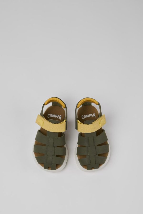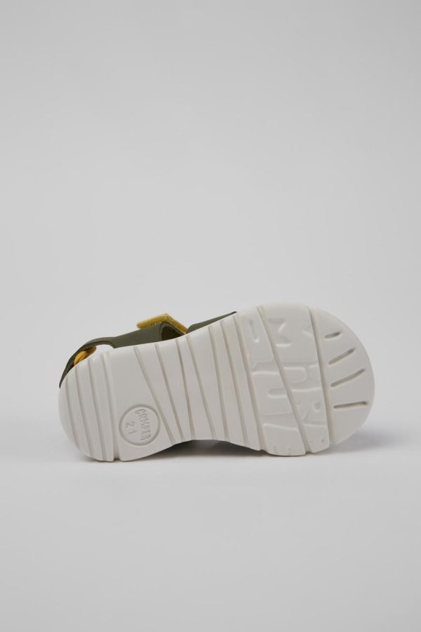 Green leather and textile kids’ sandals with a hook-and-loop closing system and EVA outsoles.