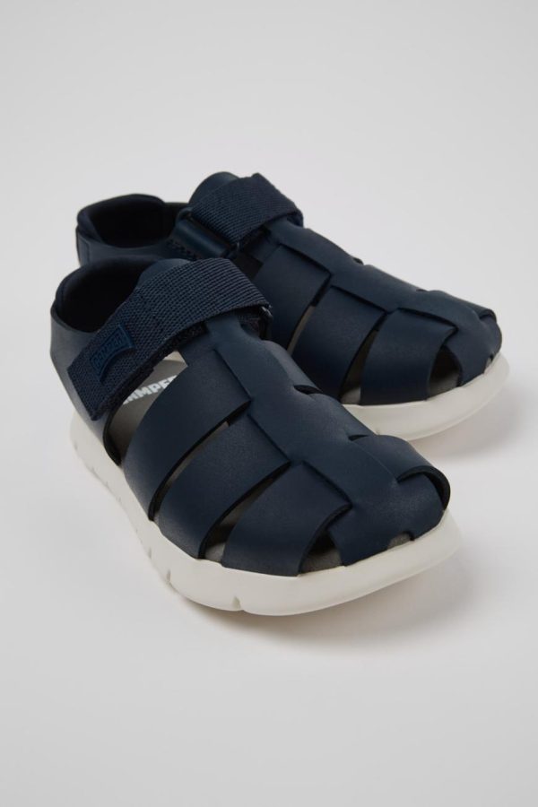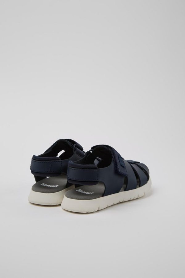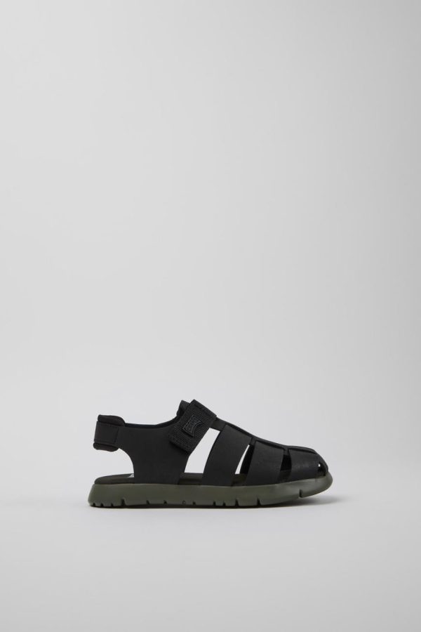 Black leather and textile kids’ closed sandals with hook & loop system and EVA outsoles.