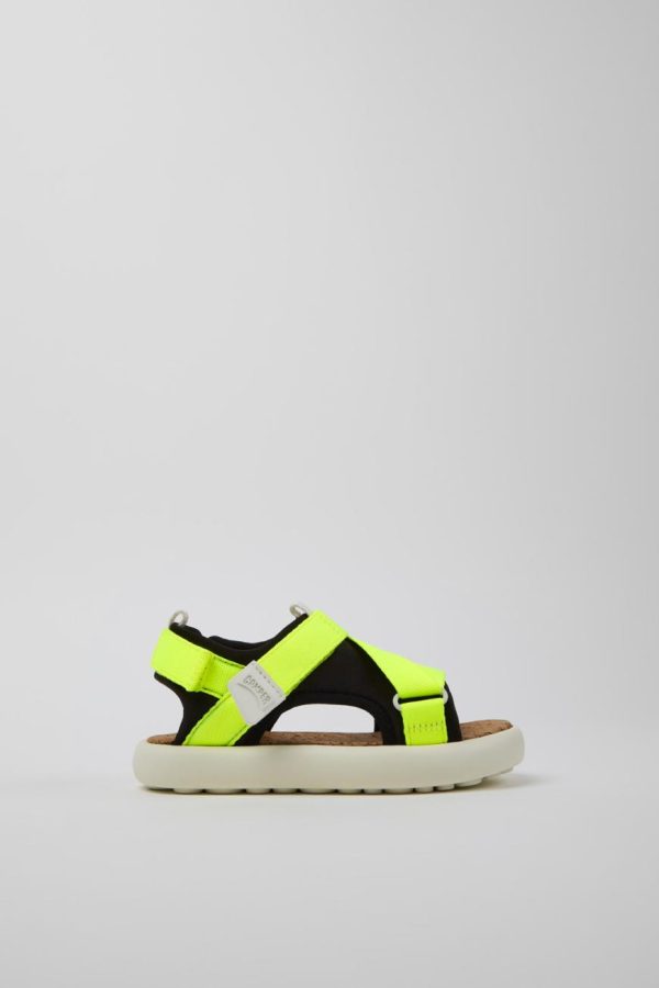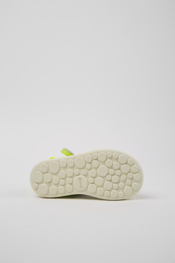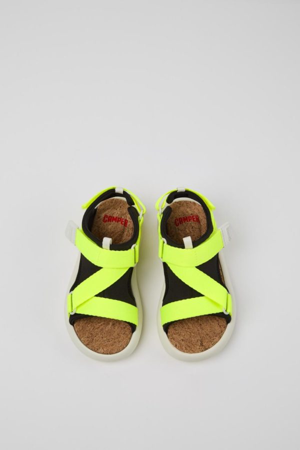 Multicolor recycled PET kids’ sandals with hook & loop system, EVA footbeds, and EVA outsoles.