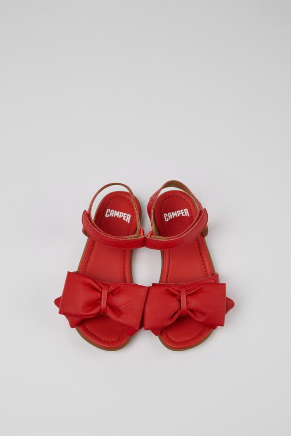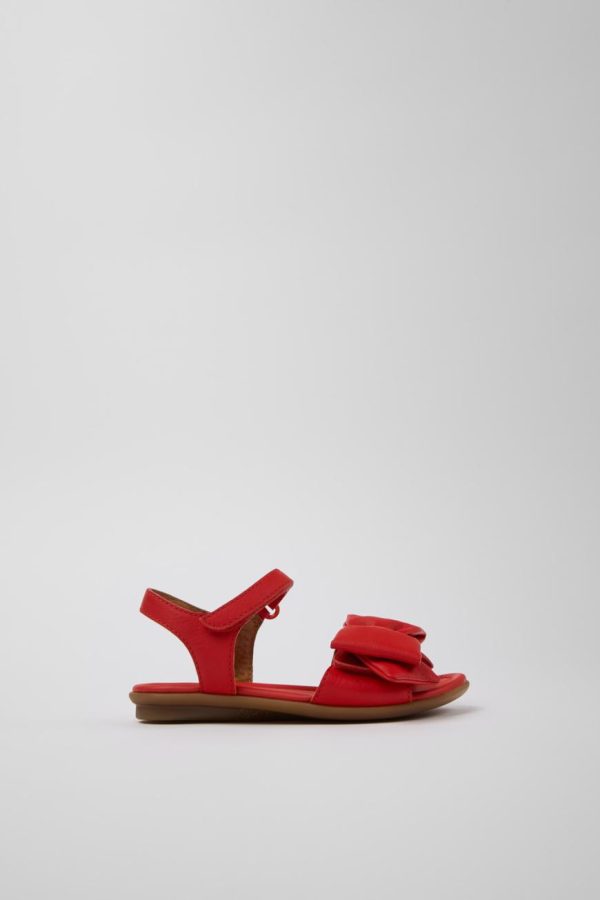 Red leather kids’ sandals with hook & loop system and rubber outsoles.