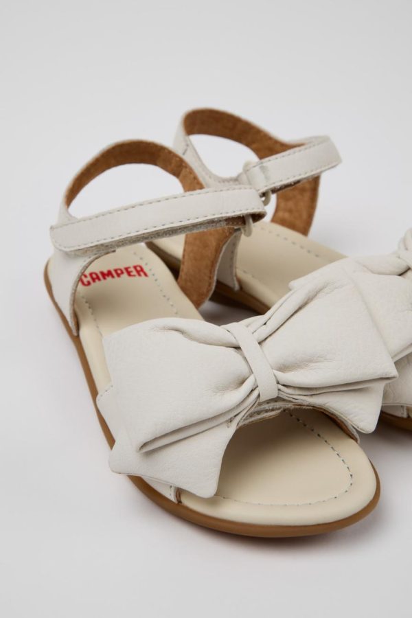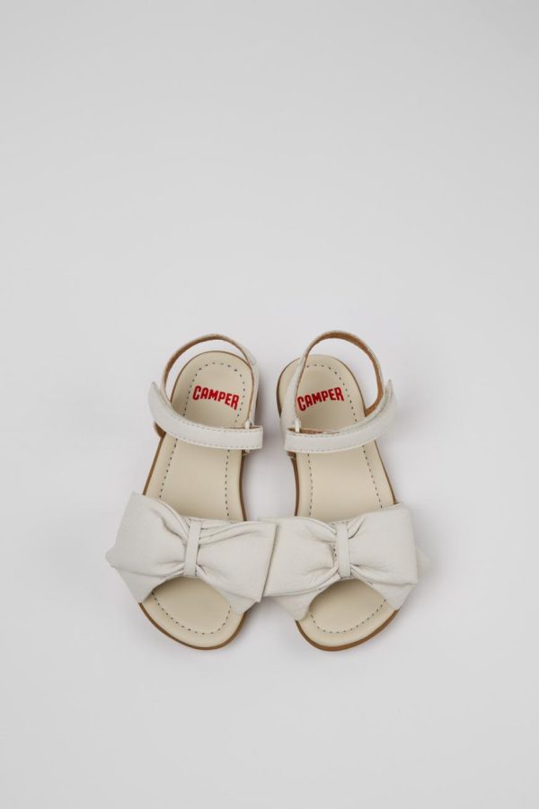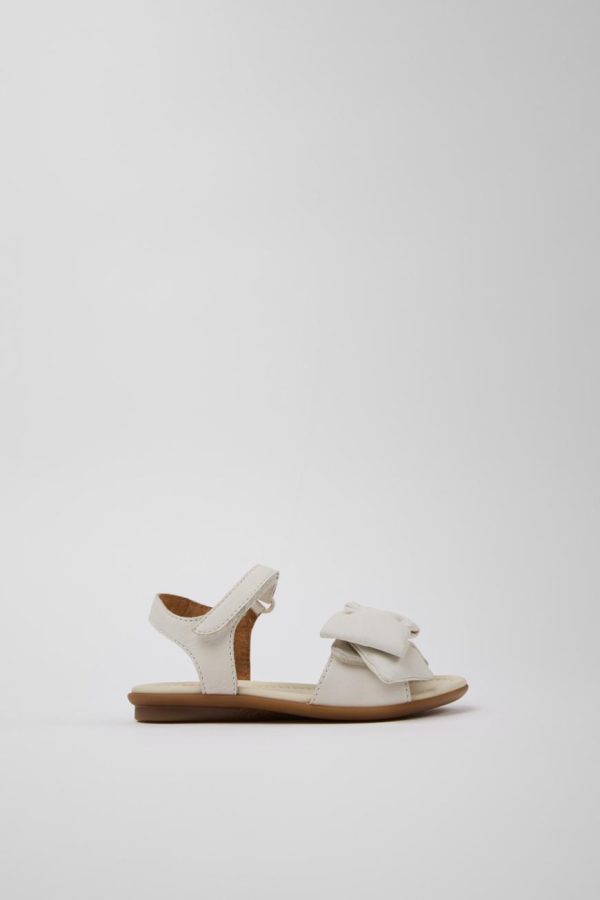White leather kids’ sandal with hook & loop system and rubber outsoles.