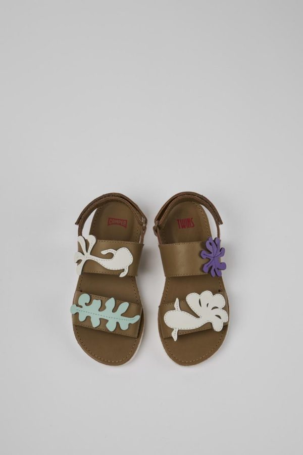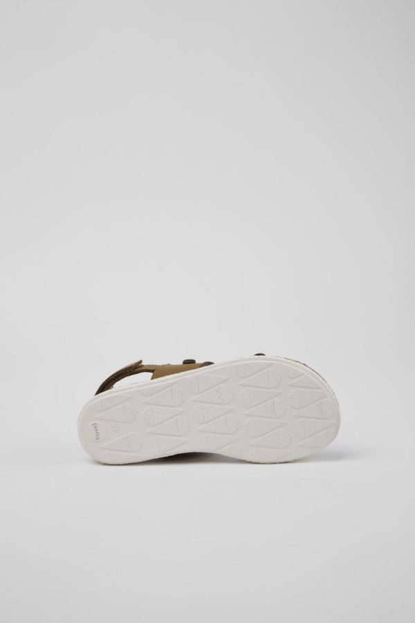 Brown leather kids’ 2-strap sandals with chrome-free leather-lined footbeds and 100% rubber outsoles.