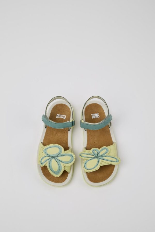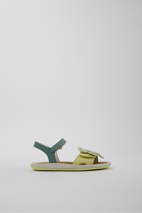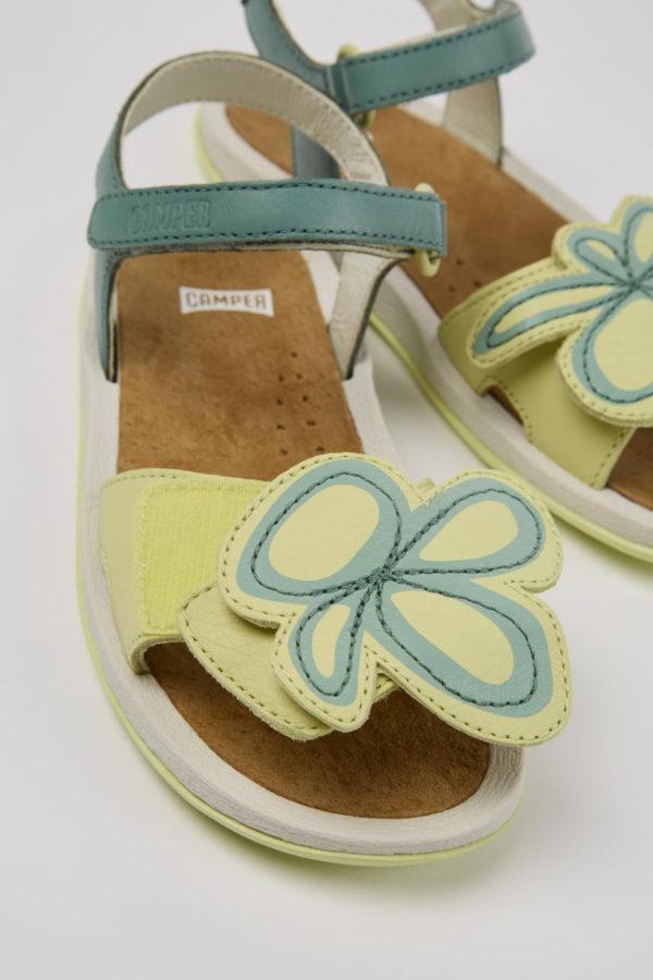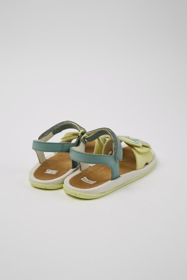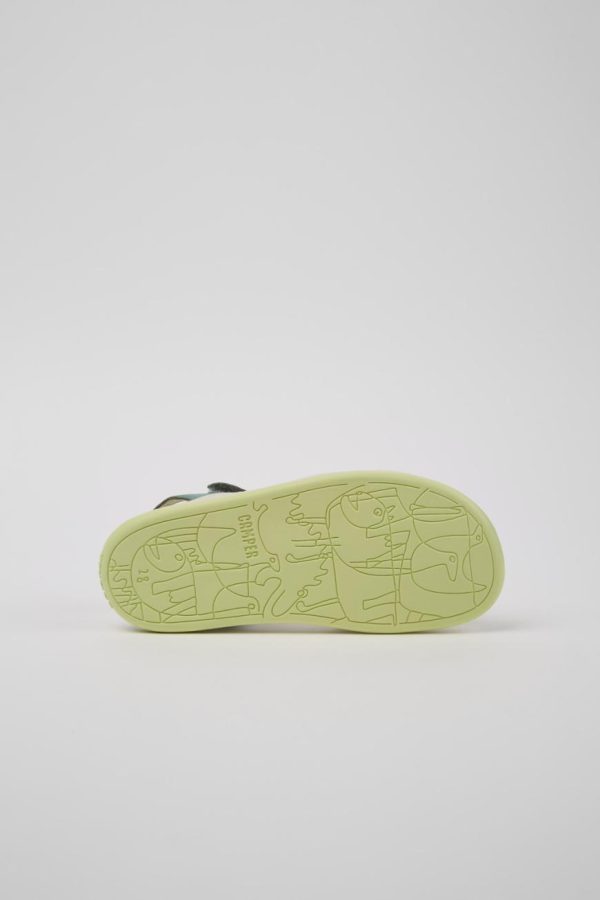 Multicolor leather kids’ sandal with hook & loop system and rubber outsoles (20% recycled).
