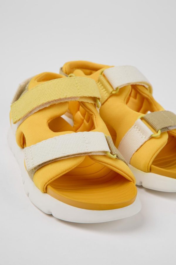 Orange textile kids’ sandals with a hook-and-loop closing system and EVA outsoles.
