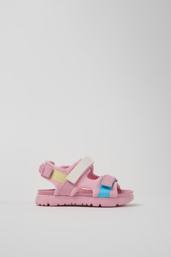Multicolor water-friendly textile kids’ sandals with hook & loop system and EVA outsoles.