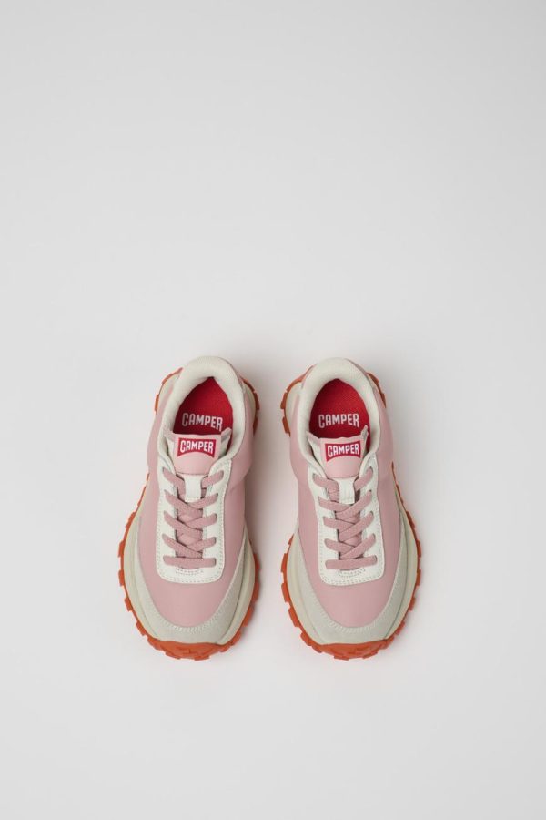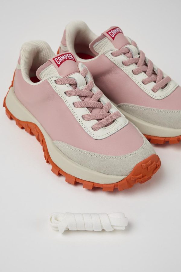 Pink and gray leather and nubuck kids’ sneakers with elastic laces, removable PU footbeds and 70% rubber, 30% EVA outsoles.