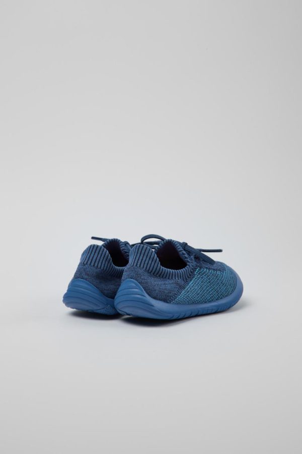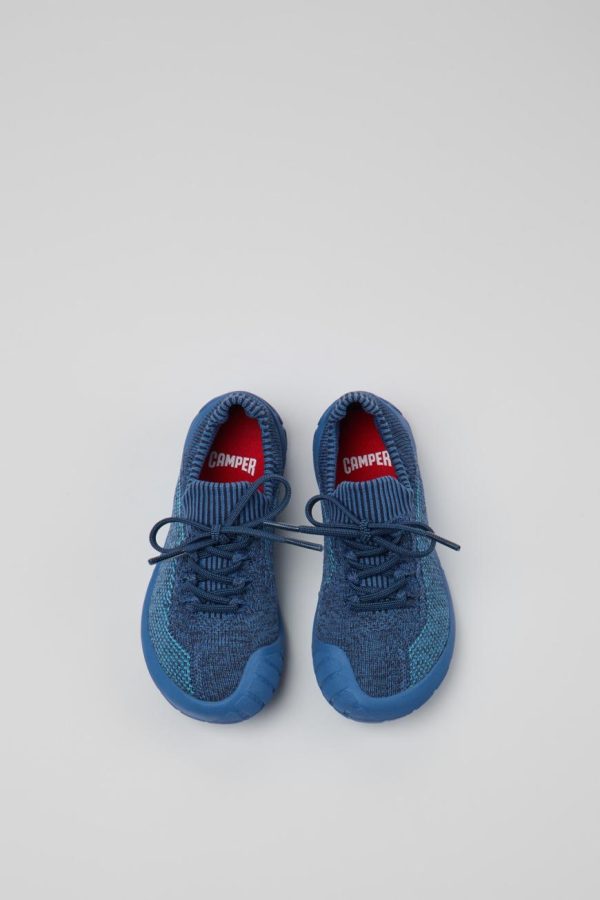 Blue simplified knit upper kids’ sneakers with OrthoLite® Recycled™ footbeds and rubber outsoles (20% recycled).