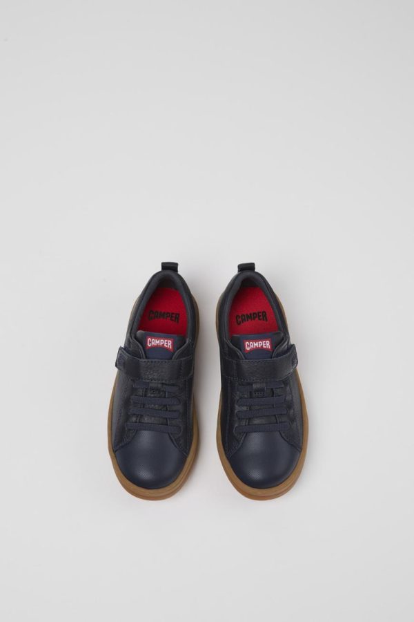 Blue calfskin leather and textile kids’ sneakers with OrthoLite® Recycled™ footbeds, elastic laces, hook and loop system, and runner outsoles.
