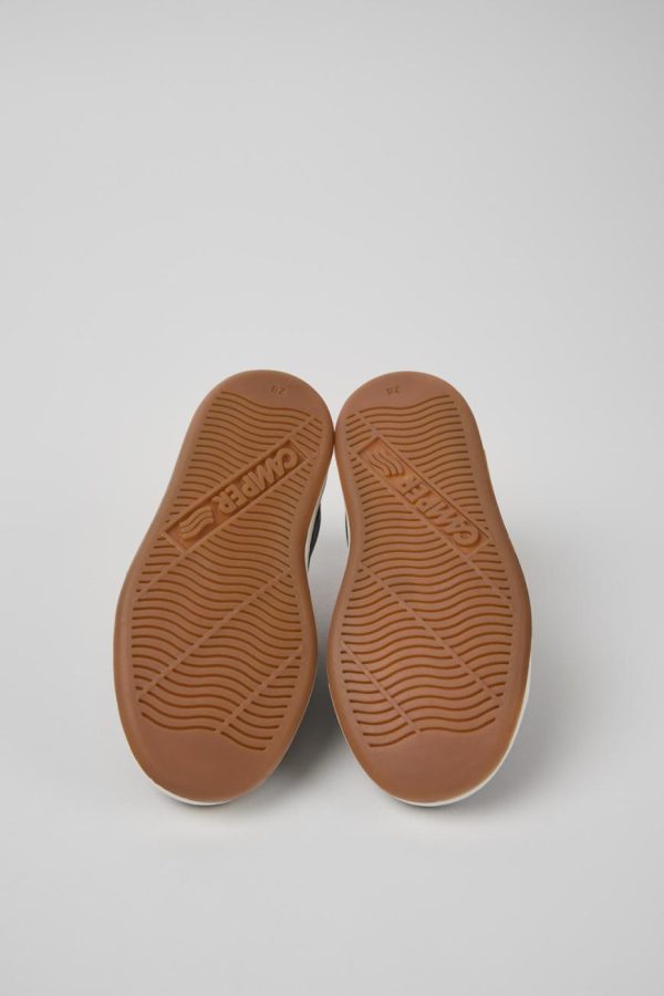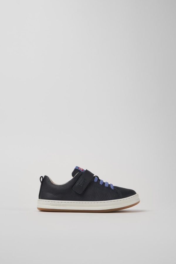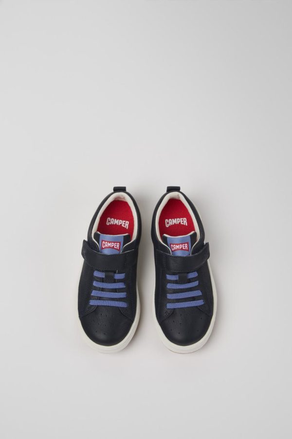 Blue calfskin leather kids’ sneakers with OrthoLite® Recycled™ footbeds, elastic laces, hook & loop System, and rubber outsoles.