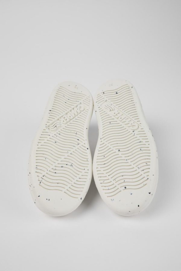 White kids’ sneakers with recycled leather, water-saving leather details, lace & zip closures, OrthoLite® Recycled™ footbeds and rubber outsoles.