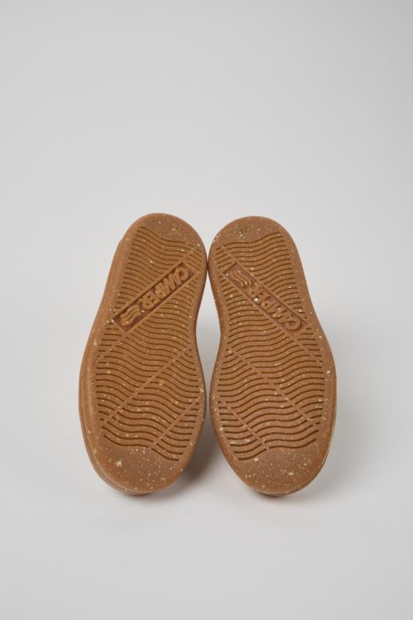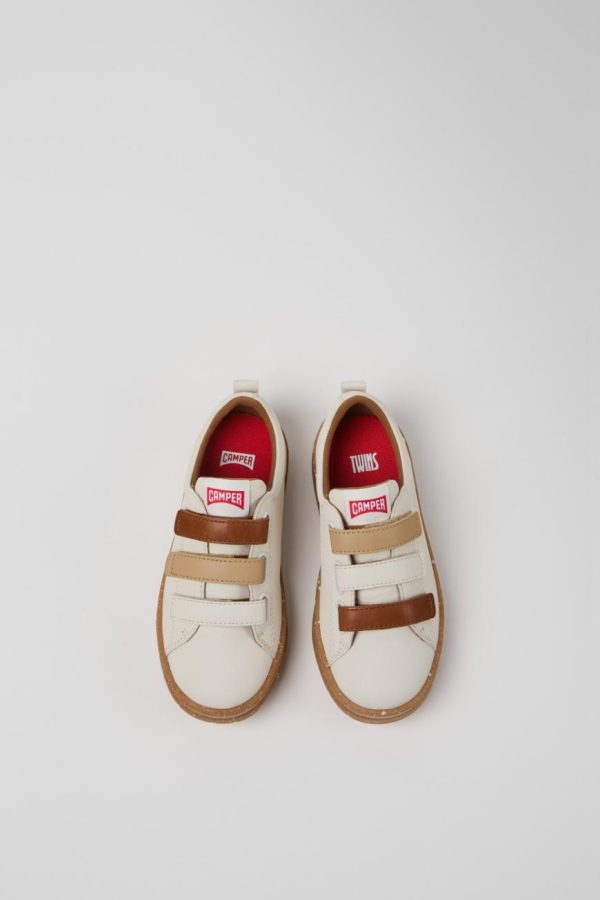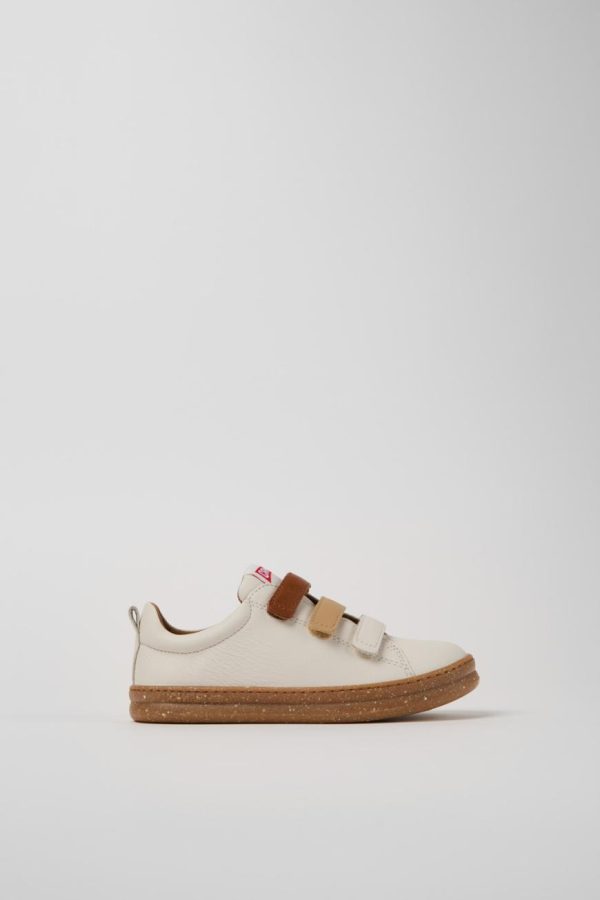 Multicolor calfskin leather kids’ sneakers with hook & loop system, OrthoLite® Recycled™ footbeds, and rubber outsoles.