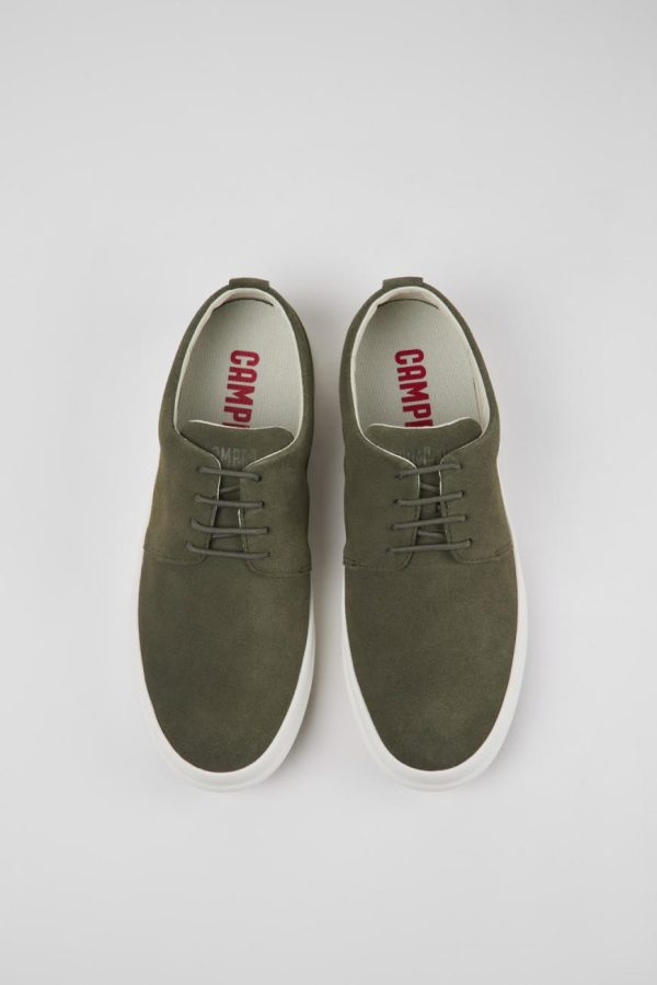 Green nubuck men’s shoes with OrthoLite® Recycled™ removable footbeds and rubber outsoles.