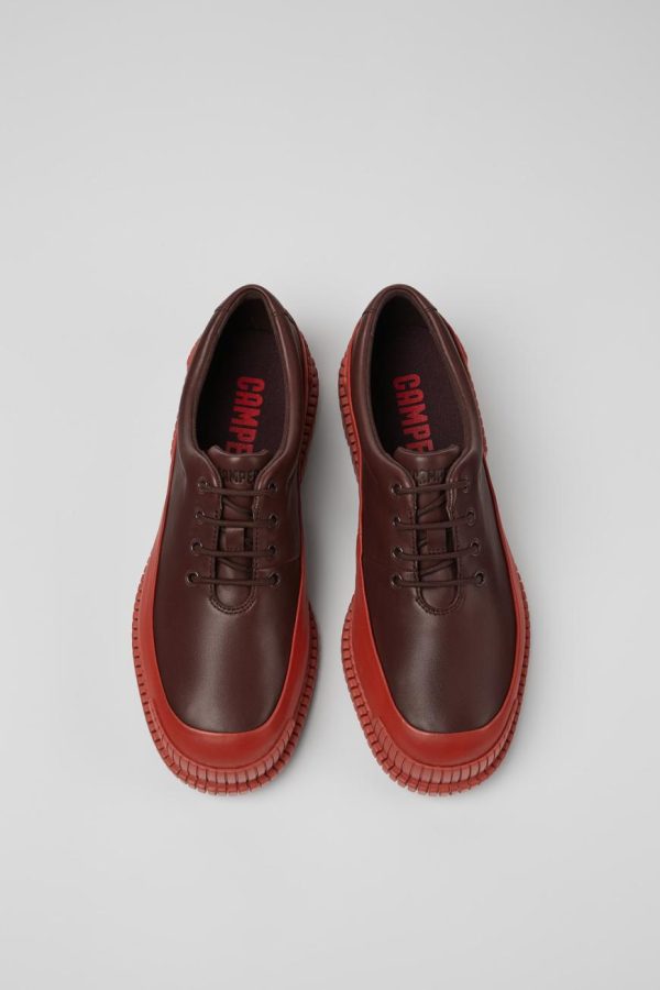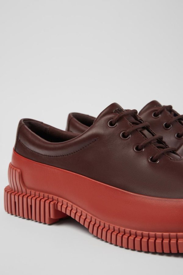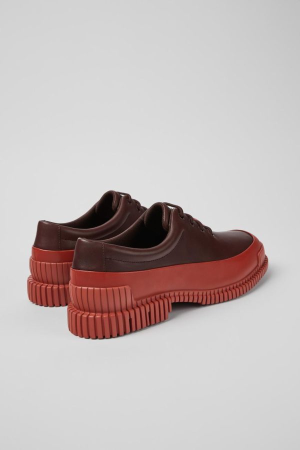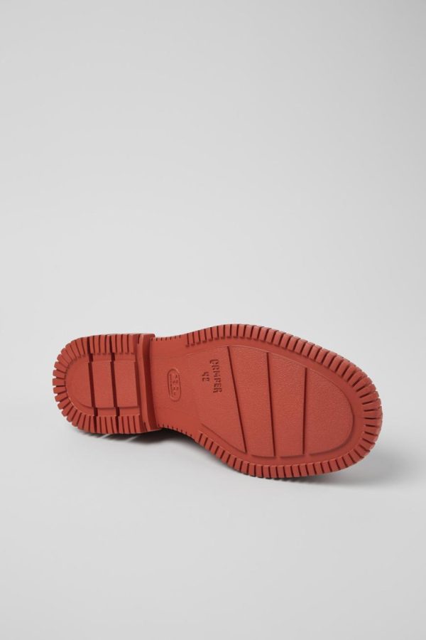 Red and brown leather men’s shoes with OrthoLite® Recycled™ removable footbeds and EVA outsoles.