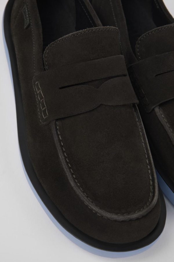 Gray nubuck men’s moccasins with lace closures, leather linings, cushioning recycled OrthoLite® footbeds, and XL EXTRALIGHT® EVA outsoles.