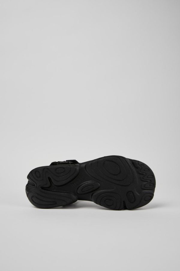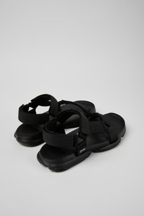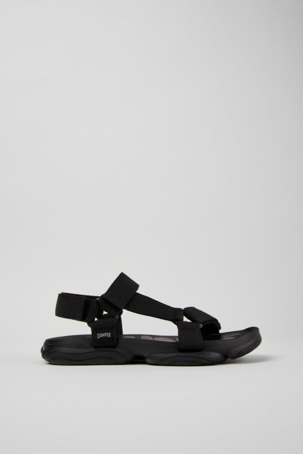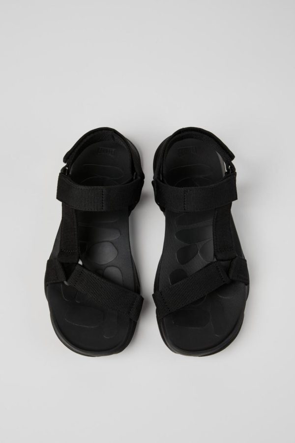 Black recycled PET webbing men’s sandals with hook & loop system and XL EXTRALIGHT® EVA dual-canal outsoles (20% recycled).