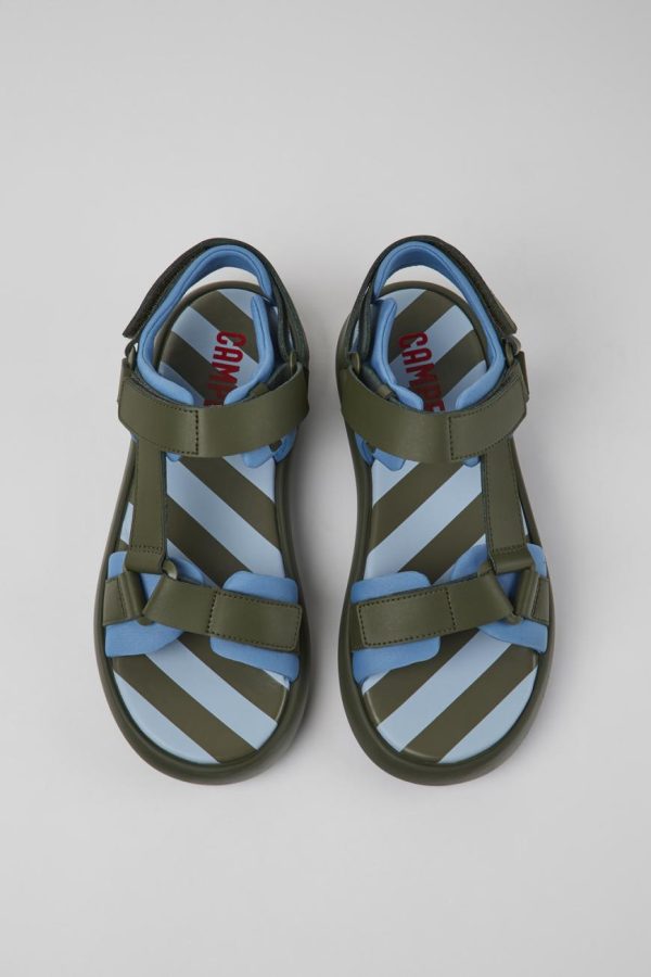 Green and blue leather and textile men’s sandals with anatomic non-removable EVA footbeds and XL EXTRALIGHT® Organix™ 3.0 outsoles (30% bio-circular compounds).