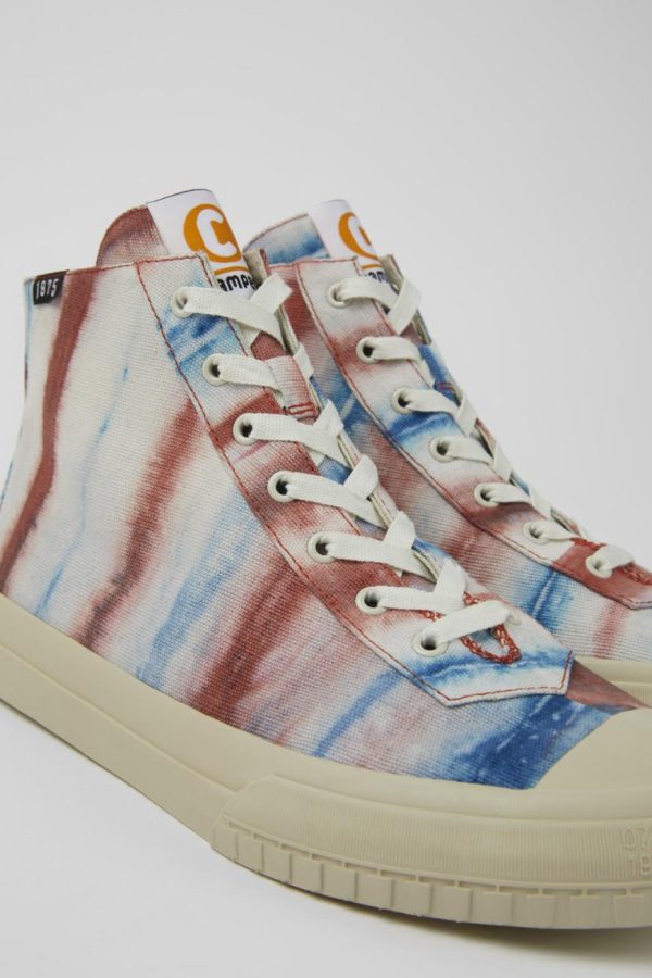 Multicolored 100% organic cotton men’s sneakers with tie-dye textile uppers made in collaboration with the Ethical Fashion Initiative. 23% recycled rubber and 40% natural rubber outsoles.