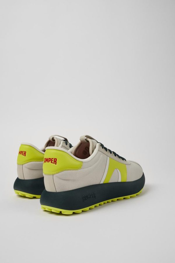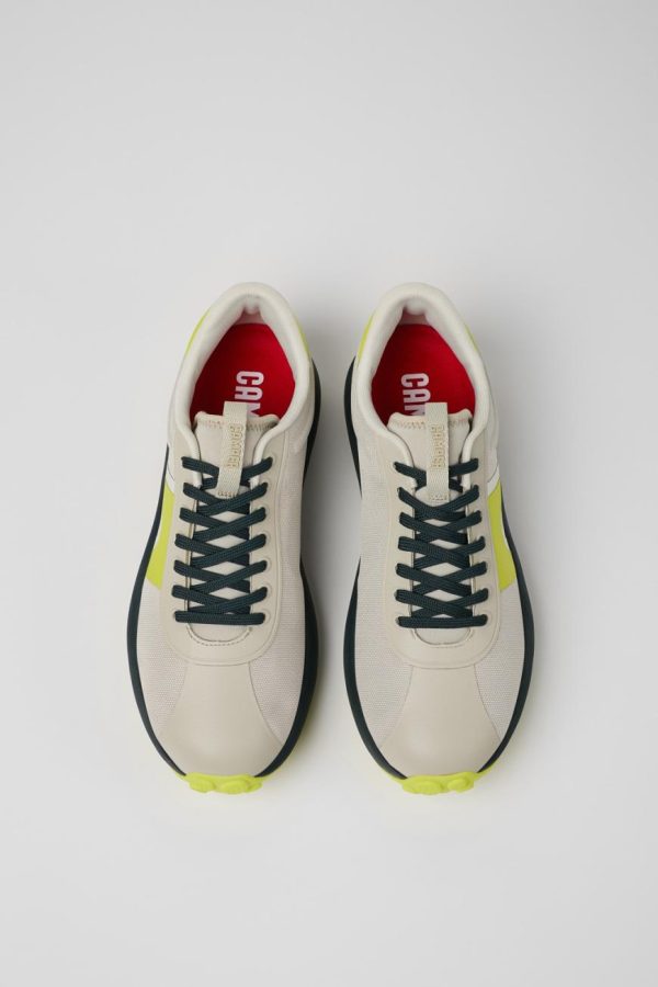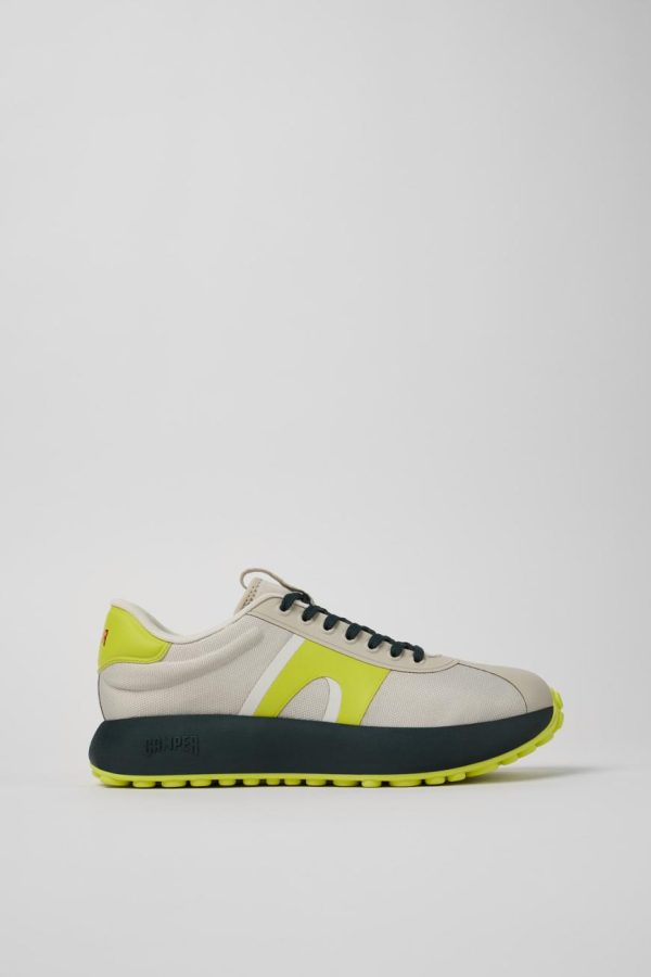 Gray-yellow men’s sneakers with recycled polyester & TPU film using stitch-free technology, lace closures, recycled OrthoLite® footbeds, and rubber/EVA outsoles.