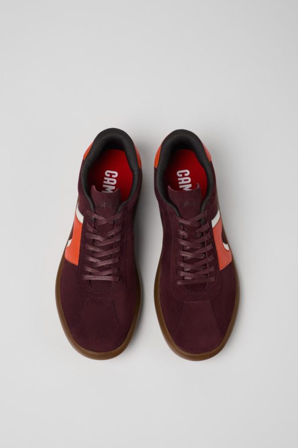 Burgundy nubuck/leather men’s sneakers with lace closures, recycled OrthoLite® footbeds, and rubber outsoles.