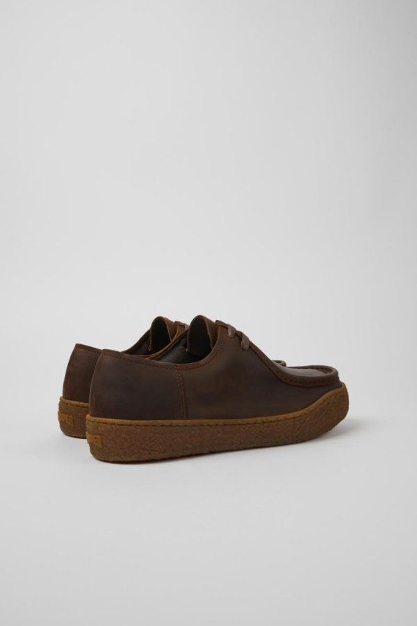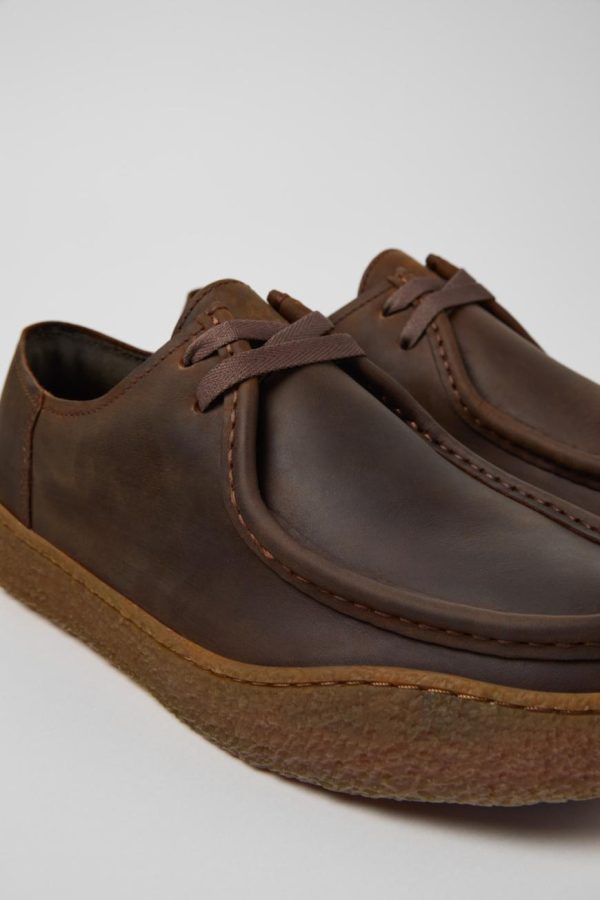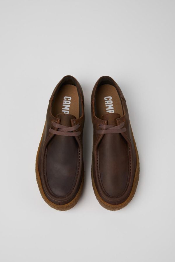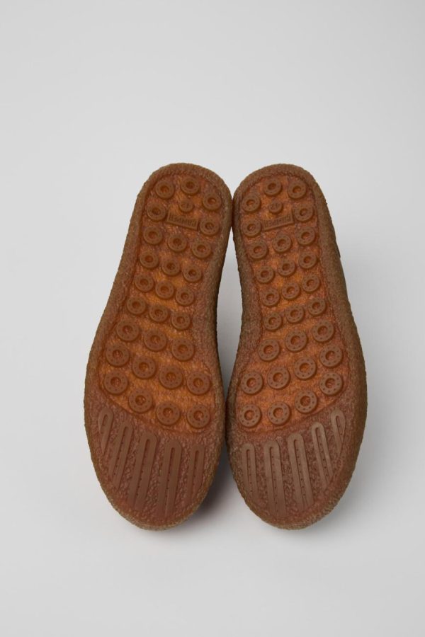 Brown nubuck men’s shoes, OrthoLite® Recycled™ non-removable footbeds, and rubber outsoles.