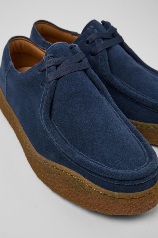 Blue nubuck men’s shoes, OrthoLite® Recycled™ non-removable footbeds, and rubber outsoles.