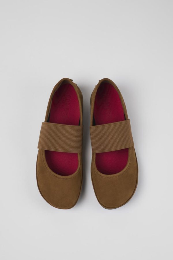 Brown nubuck women’s ballerina with EVA footbeds and recycled rubber outsoles (20% recycled).