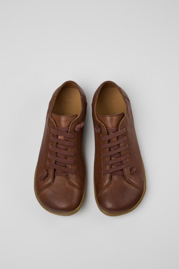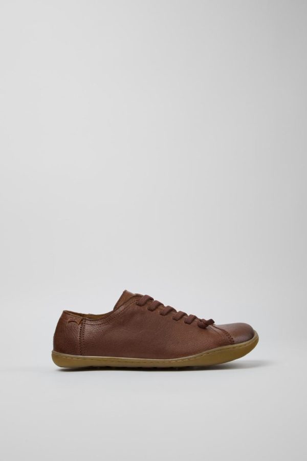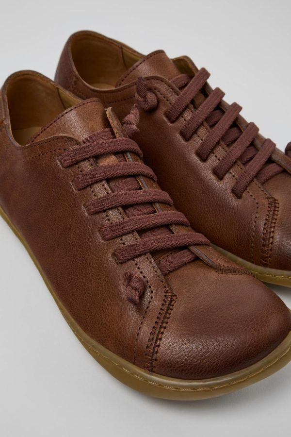 Brown leather women’s shoes with removable EVA footbeds and TPU outsoles (20% recycled).