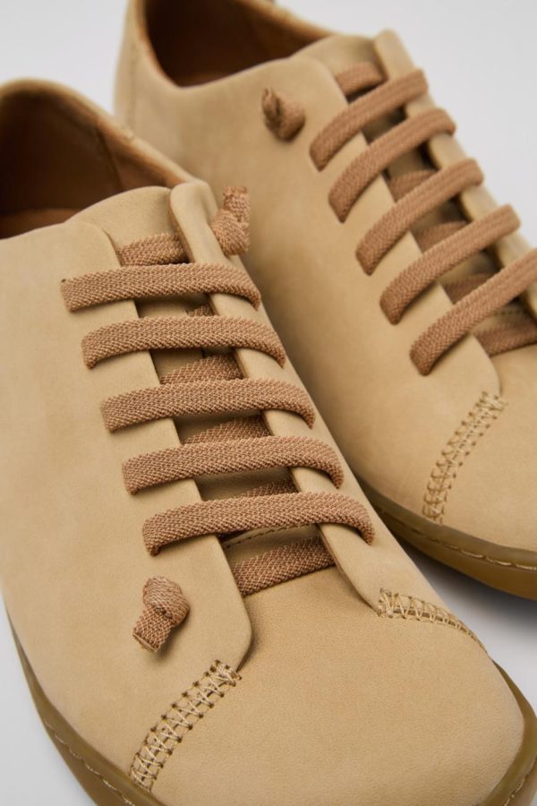 Beige nubuck women’s shoes with EVA footbeds, elastic laces, TPU outsoles (20% recycled).