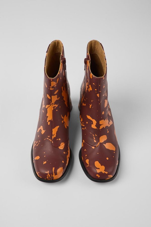 Burgundy and orange leather women’s ankle boots with a paint splash print, OrthoLite® Recycled™ footbeds, and leather-lined rubber outsoles.