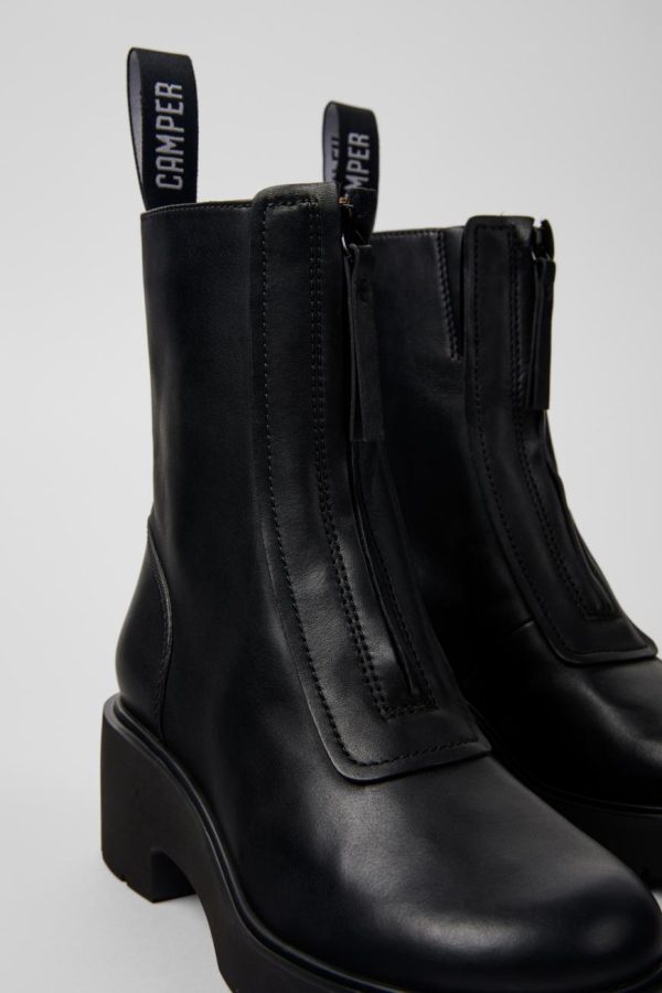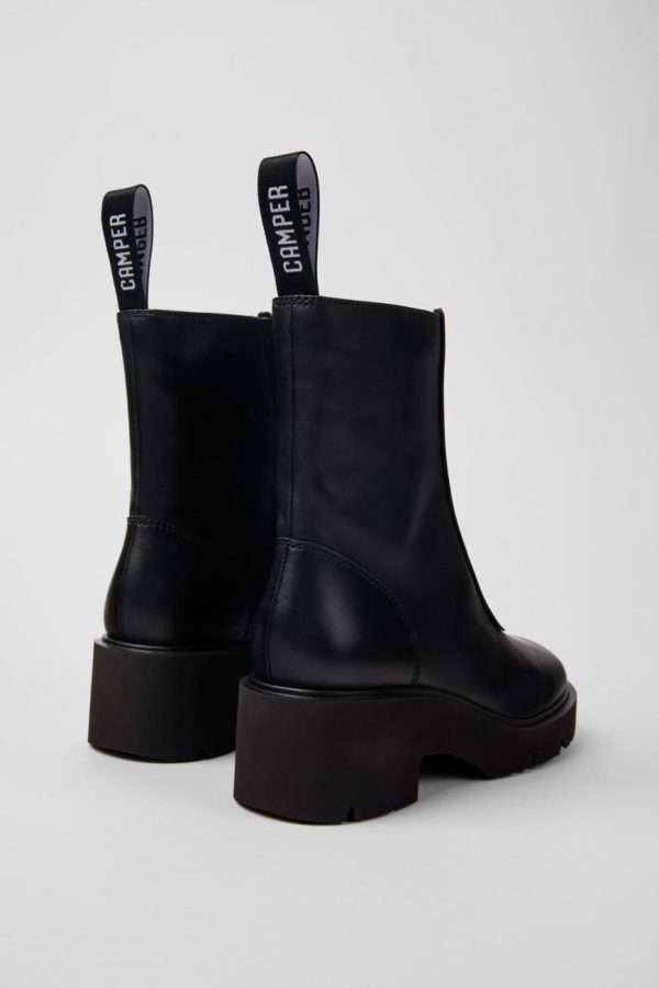 Black calfskin leather mid boots for women with OrthoLite® Recycled™ footbeds and EVA outsoles.