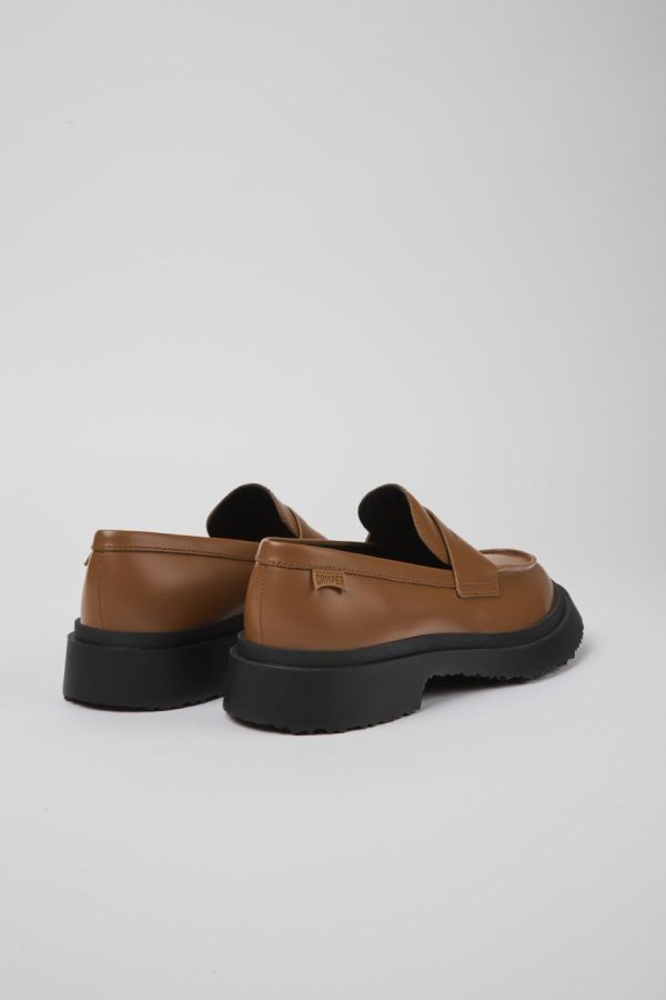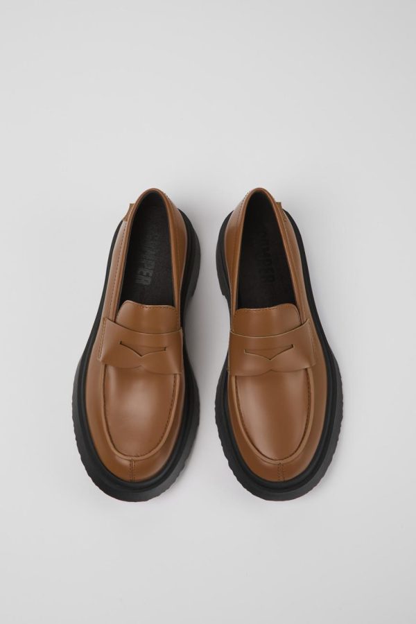 Brown leather women’s loafers with OrthoLite® Recycled™ removable footbeds and rubber outsoles.